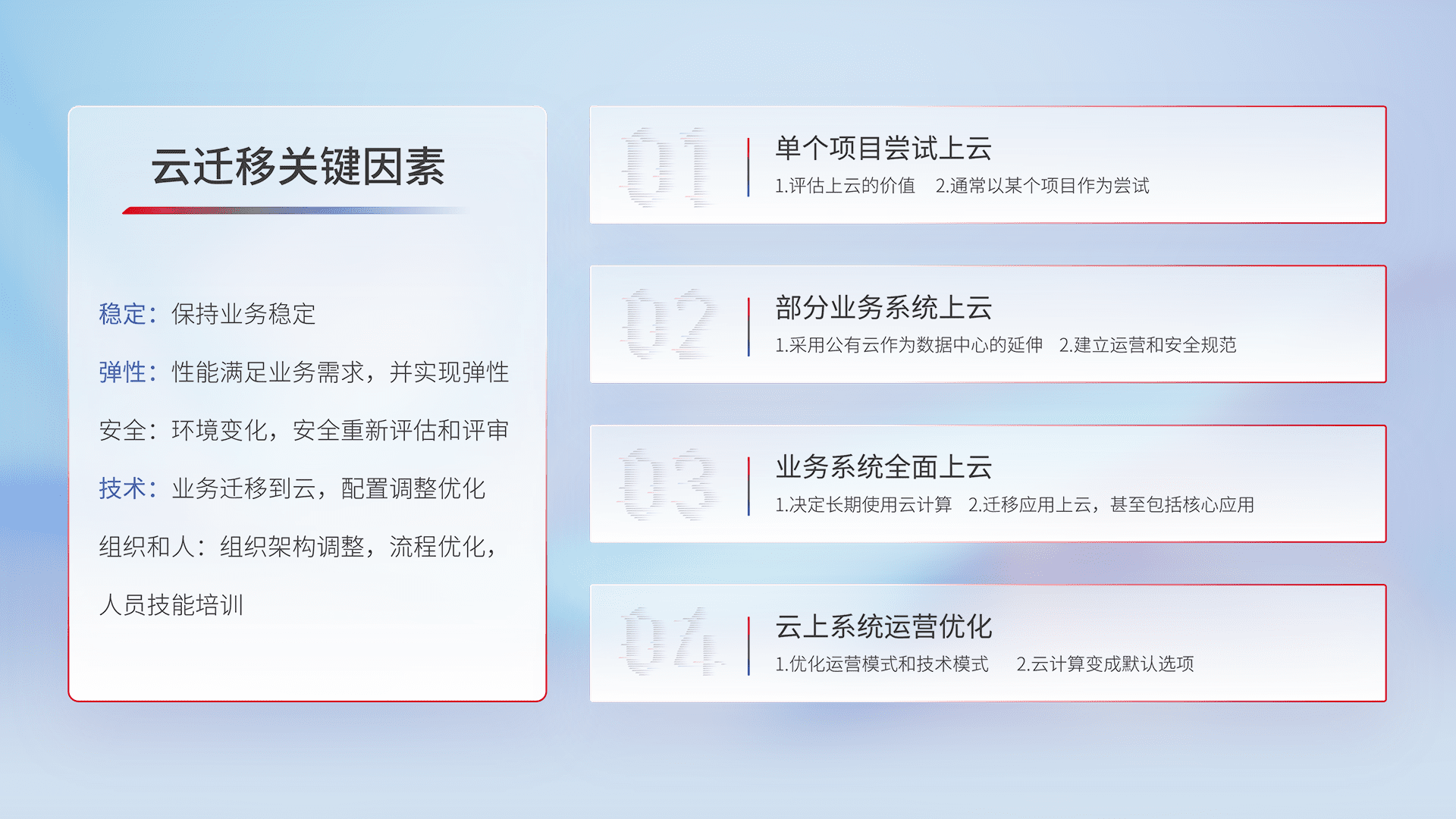 结合实际业务,,从规划设计、、云平台选型、、、云原生改造、、数据迁移、、、、集成交付,,,,迁移全过程为客户识别最佳上云路径,,,,做好风险识别管理,,,,设计网络架构、、、身份权限、、、、安全审计合规、、操作审计、、、、日志审计、、监控告警策略、、多站点容灾设计等,,,,对云上基础设施进行整体规划,,,,提升IT治理水平,,,以满足弹性、、、、高可用、、、高性能的需求。。。
